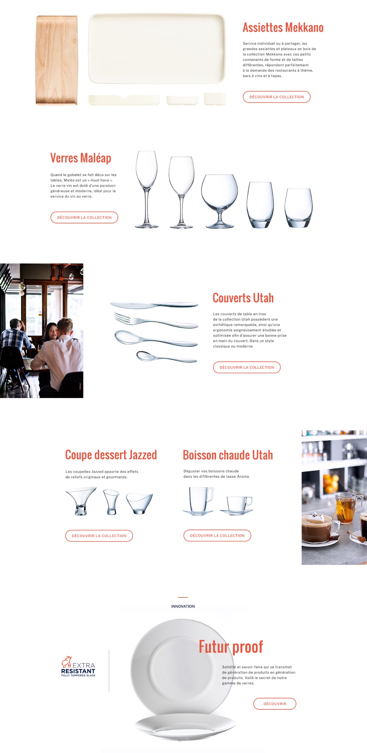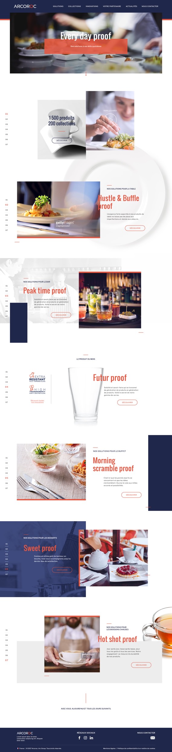 Nous avons proposé de repenser l’identité digitale de la marque en repensant le site internet autour d’une nouvelle signature “ everyday proof”, qui vient affirmer l’ambition d’Arcoroc : une vaisselle à l’épreuve du quotidien pour les restaurateurs et consommateurs. L’histoire du site s’écrit autour de ces objets uniques qui incarnent l’excellence et la durabilité.