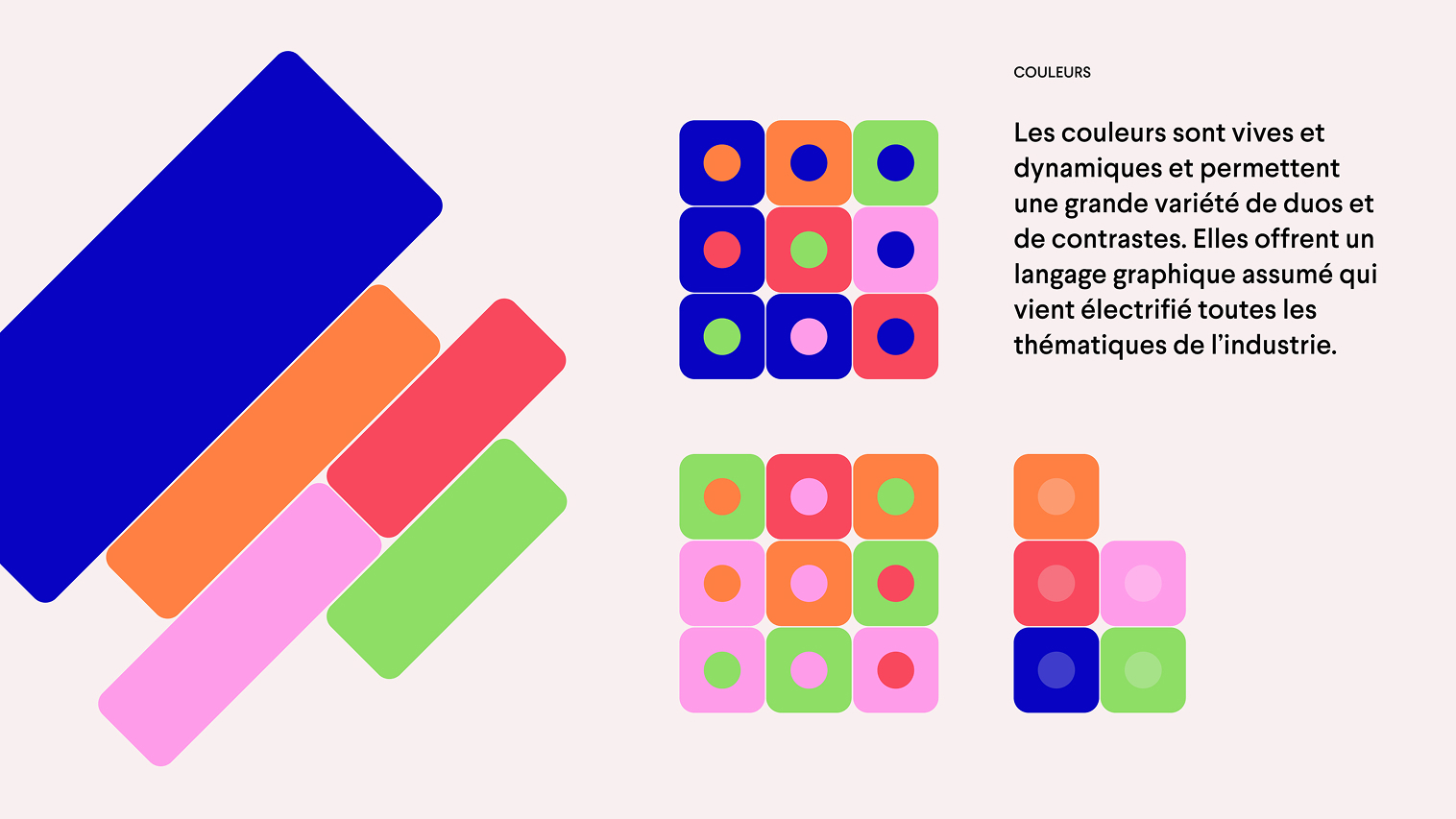 Les couleurs sont vives et dynamiques et permettent une grande variété de duos et de contrastes. Elles offrent un langage graphique assumé qui vient électrifié toutes les thématiques de l’idustrie.