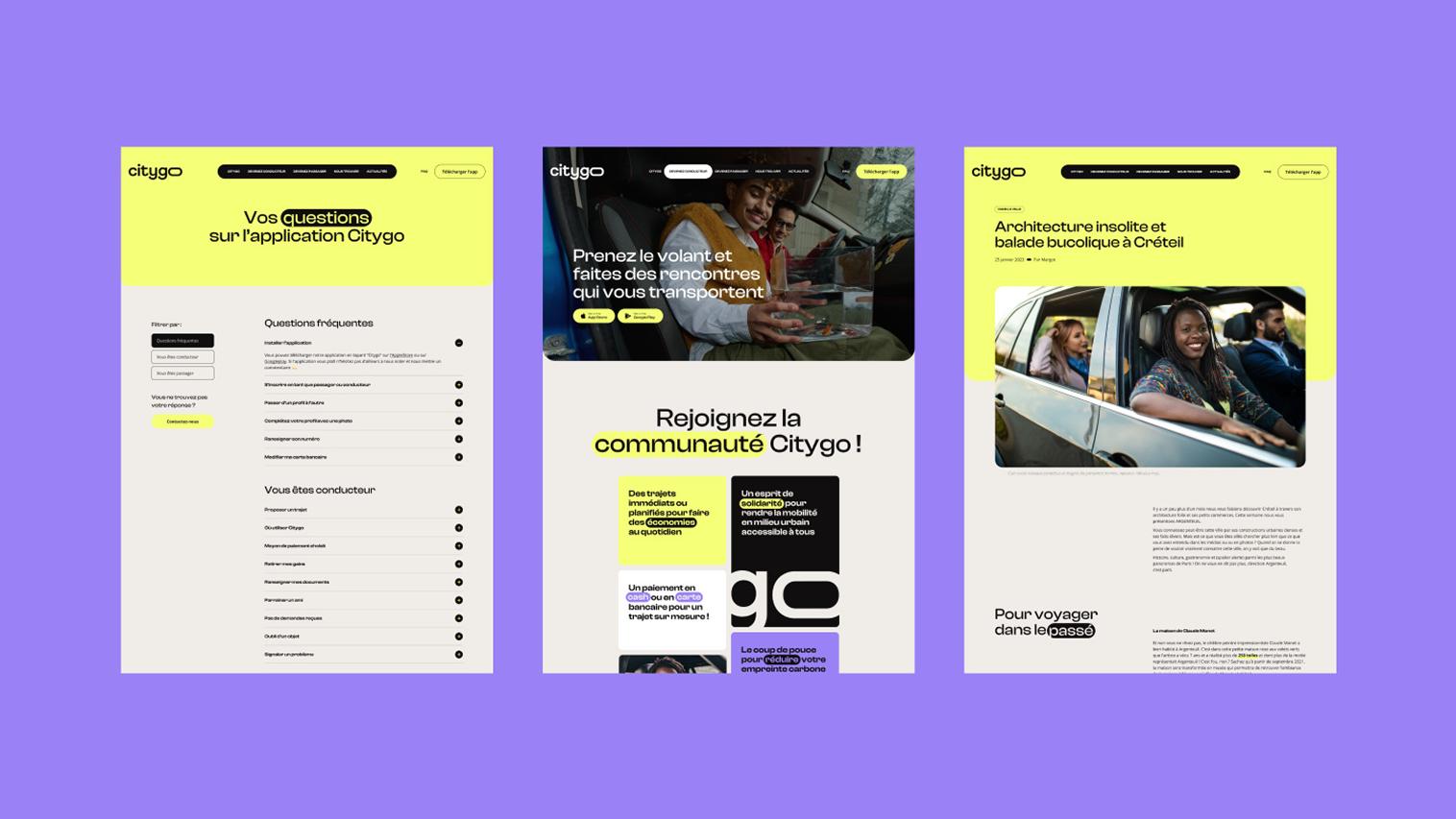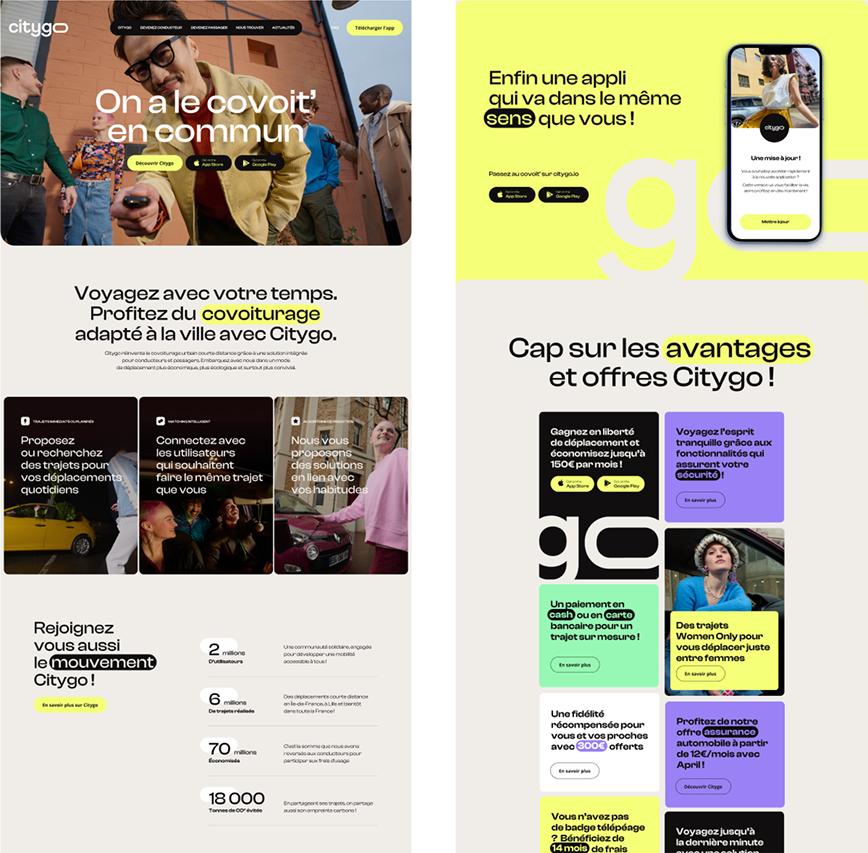 Étant une application de particulier à particulier, ce sont les usagers qui font la qualité du service. Nous avons donc retravailler complètement l’image de marque à travers un branding plus lifestyle, pour permettre à citygo de s’imposer comme un mouvement collectif, pour faire du covoiturage urbain un état d’esprit et aller au-delà d’un usage simplement pratique. L’idée était de révéler la valeur sociétale du covoiturage urbain pour faire émerger citygo comme un acteur de transformation de la mobilité.