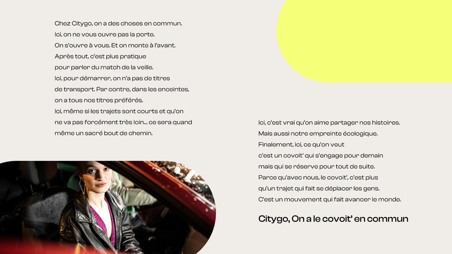 Précurseur dans le domaine du covoiturage urbain, la marque souffrait d’une confusion persistante avec les services de VTC. La principale motivation des utilisateurs était jusque-là purement économique, devenant un frein à son développement et à la qualité de son service. Citygo souhaitait faire évoluer son image de marque pour passer d’un service purement fonctionnel à un service dont l’utilisation est guidée par des valeurs.
