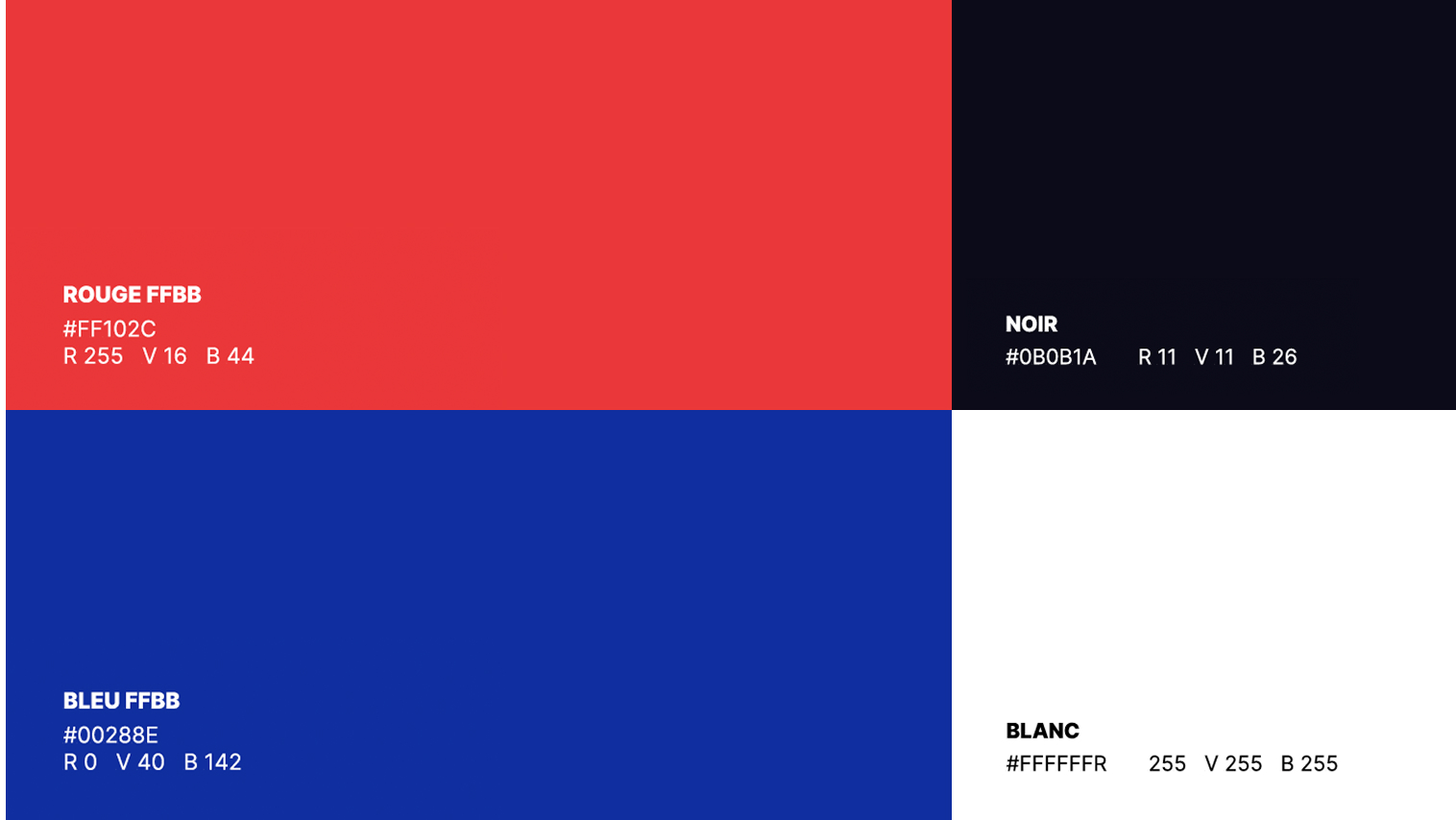 Duo colorimétrique : bleu FFBB (#00288E) pour le dynamisme, rouge FFBB (#FF102C) pour l’énergie, complétés par blanc et noir