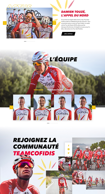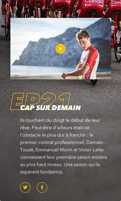 La websérie devient une étape du Tour. Nous avons conçu une navigation progressive et chronologique, alignée sur les étapes de la course. Les choix UX/UI traduisent la progression sportive en une ascension digitale. Photos immersives, vidéos intégrées, rythme narratif soutenu : chaque élément renforce l’impression d’accompagner l’équipe Cofidis de l’intérieur, comme si l’utilisateur pédalait aux côtés des coureurs.
