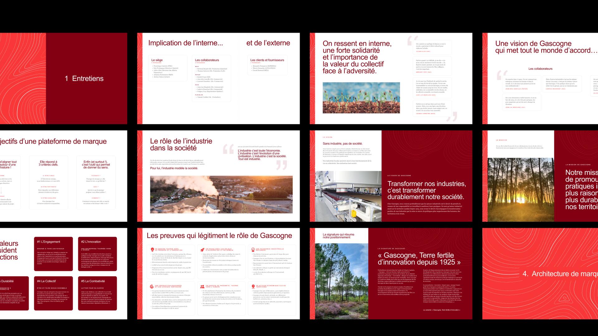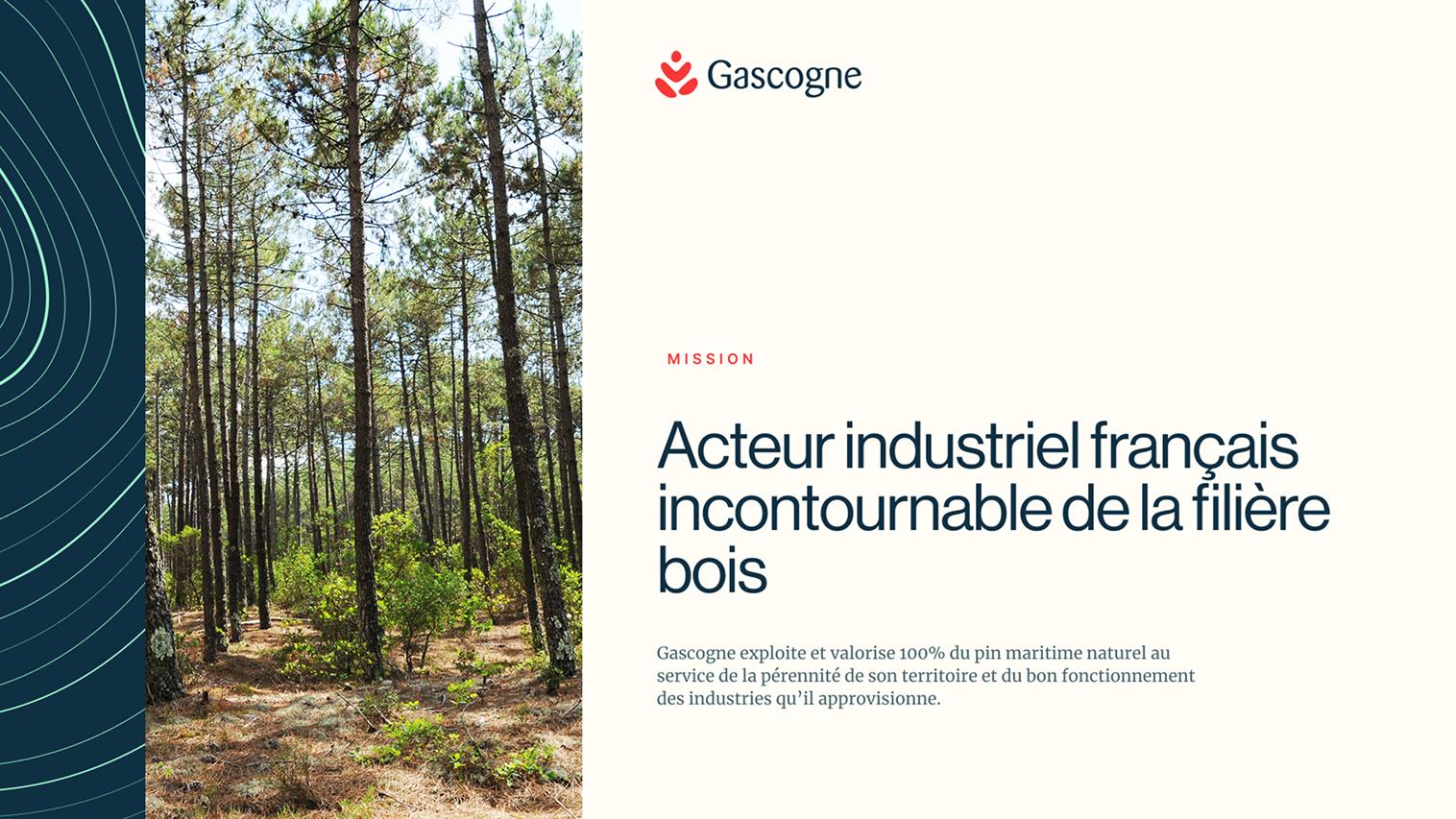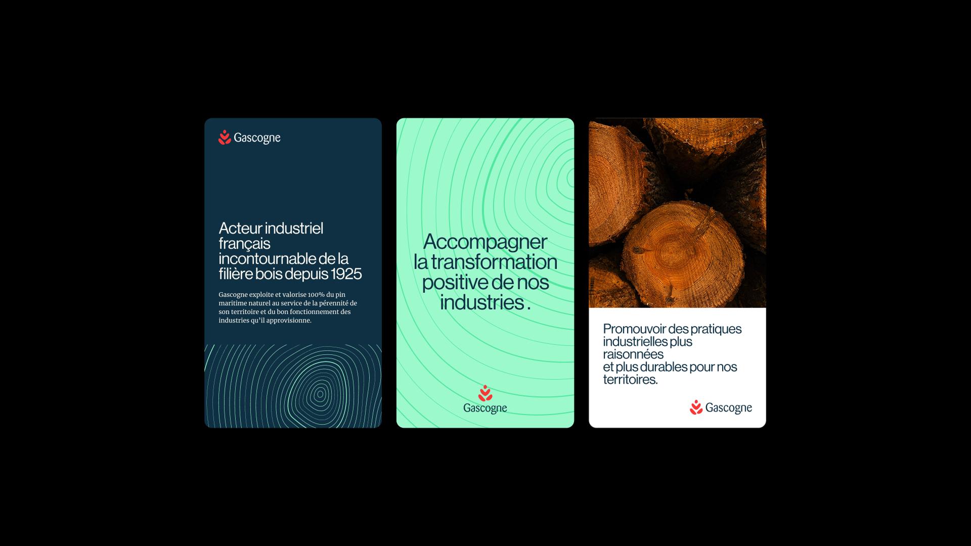 C’est une identité visuelle refondue en profondeur. Son point de départ : la matière bois et le territoire landais. De là, un système graphique a été conçu, capable de se décliner pour illustrer les spécificités de chaque activité, tout en garantissant une cohérence globale. Gascogne passe ainsi d’une image éclatée à un univers unifié : un langage de marque qui fédère ses quatre branches, incarne son savoir-faire et projette sa vision d’avenir.