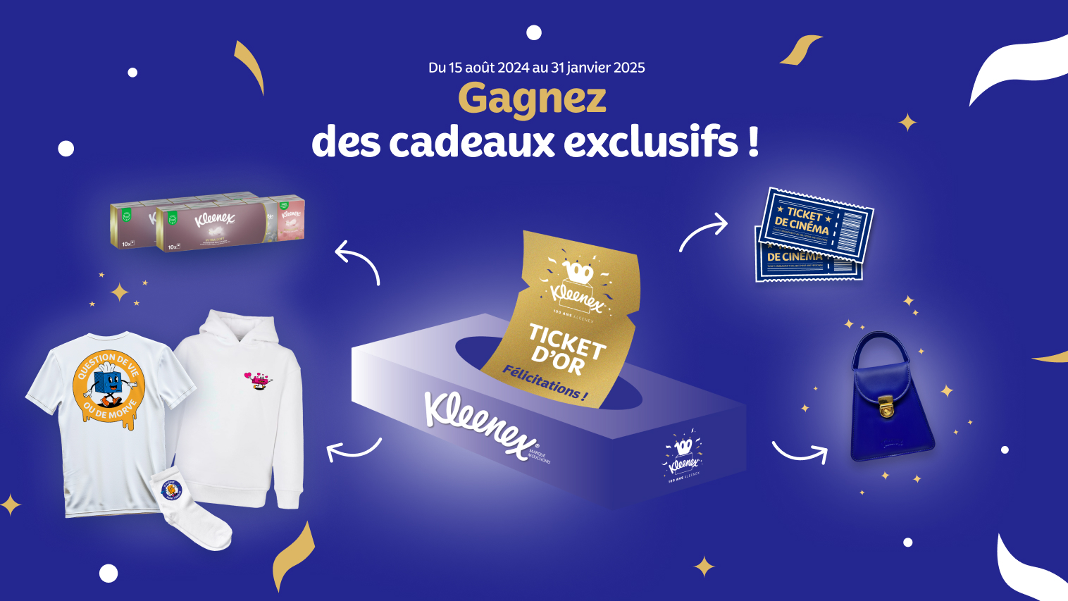 Kleenex rejoint le club des marques centenaires et souhaite offrir de beaux cadeaux à ses consommateurs via une mécanique de tickets d’or en magasin et en ligne.