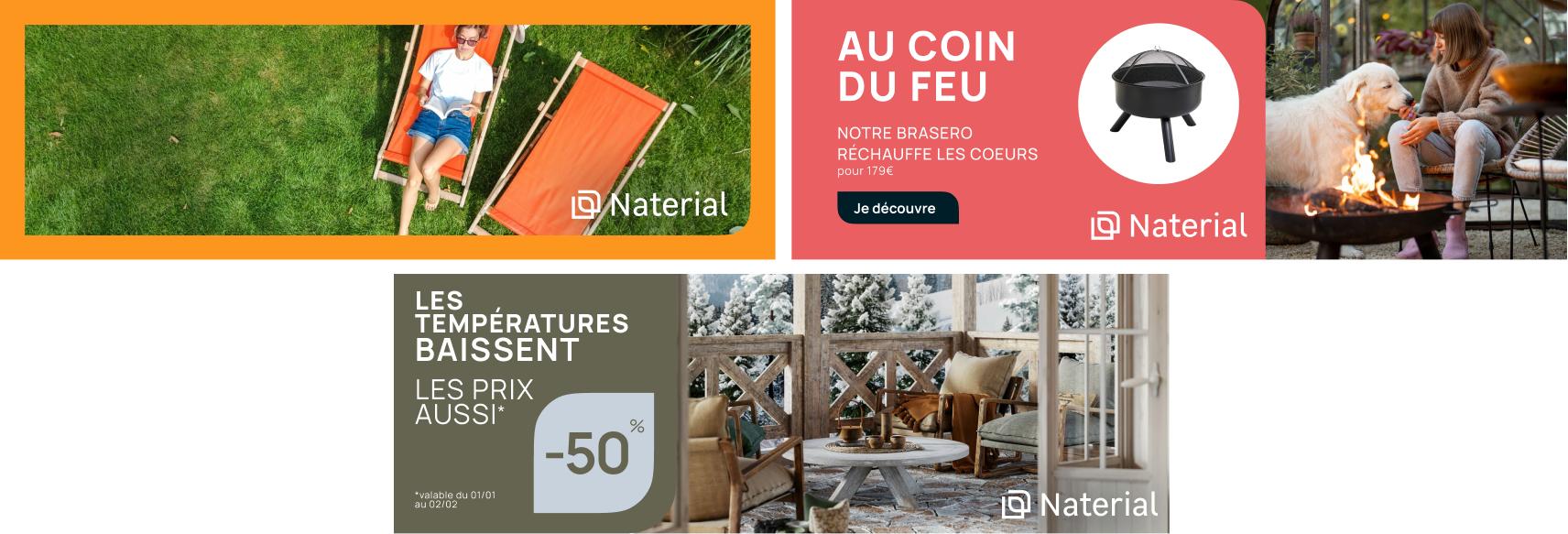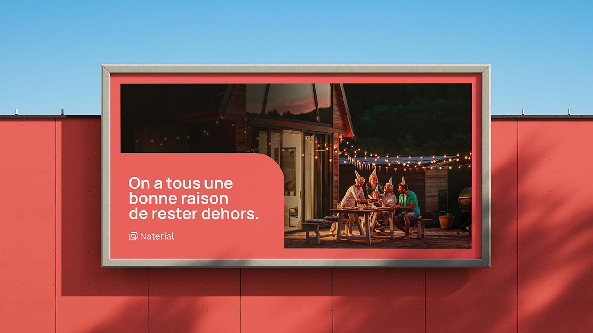L’extension du territoire graphique a permis de donner à Naterial une identité visuelle riche et immédiatement reconnaissable. Inspirée des formes arrondies de son logotype, la nouvelle bibliothèque graphique offre rythme et flexibilité à chaque contenu. Couleurs, formes et compositions traduisent une même ambition : faire de l’extérieur un espace de vie désirable. Ce langage visuel assure cohérence et puissance, en magasin comme en digital, et renforce la posture de marque architecte de l’extérieur.