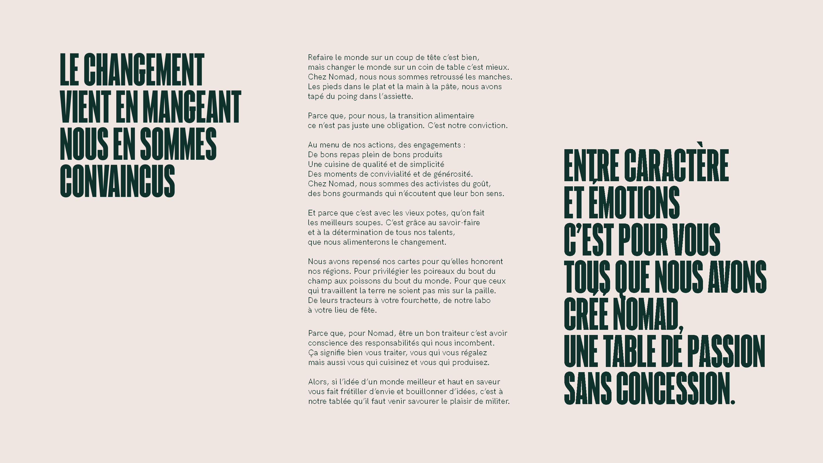 Un manifeste engagé et engageant pour mettre en mots la nouvelle vision de Nomad et inviter ses clients à rejoindre cette table de passion, sans concession.