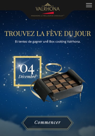 Chaque jour, une fève. Du 1er au 25 décembre, une fève, placée sur un lieu stratégique pour la marque (écoles, plantations, sièges) était disponible. Seulement en la trouvant, l’utilisateur pouvait participer au tirage au sort du jour, garantissant qu’il revienne chaque jour sur le site.